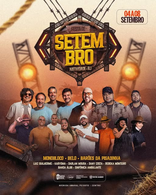 Festa de Setembro Atrações musicais Expirado 04 Set - 2025 · 00:00 > 08 Set - 2025 · 23:59 Natividade - RJ Festa de Setembro (Foto: Reprodução)