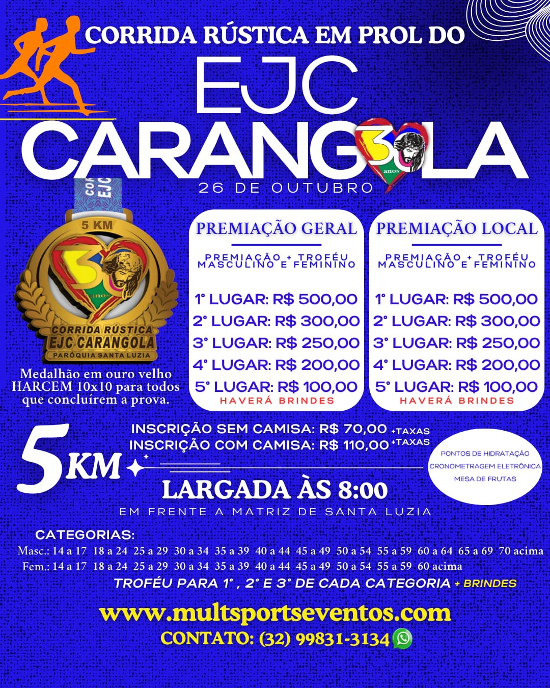 Corrida Rústica EJC Corrida em Pról do EJC Expirado 26 Out - 2025 · 00:00 > 26 Out - 2025 · 23:59 Carangola - MG Corrida Rústica EJC (Foto: Reprodução) Inscricao