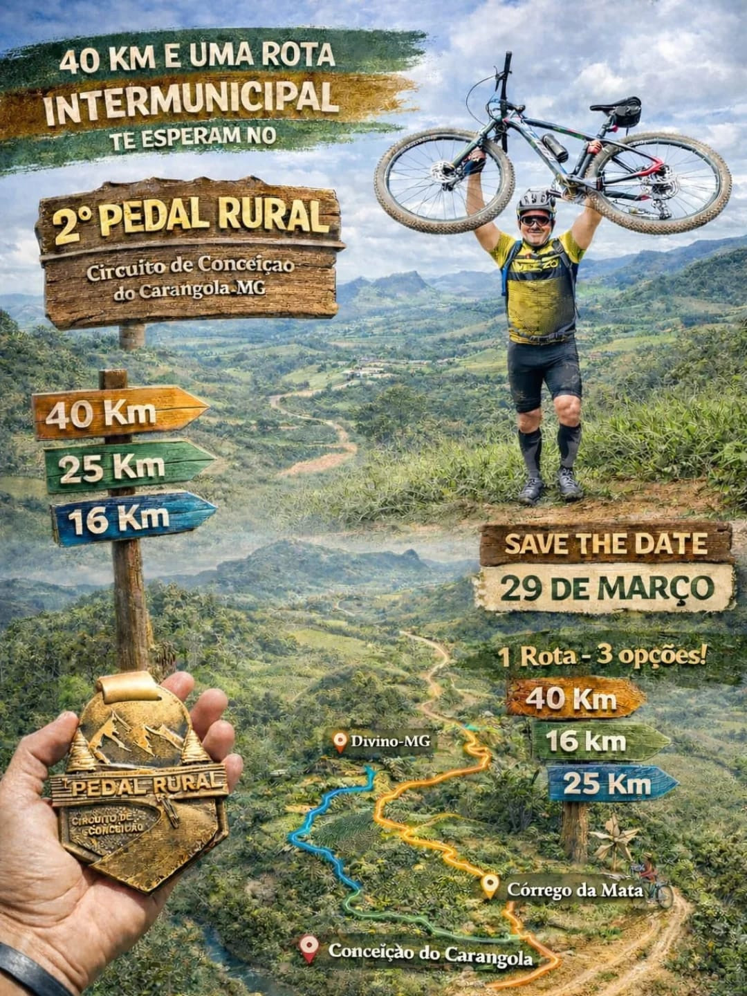 Pedal Rural - 2026 Distrito de Conceição 29 Mar - 2026 · 00:00 > 29 Mar - 2026 · 23:59 Carangola - MG Pedal Rural - 2026 (Foto: Reprodução)