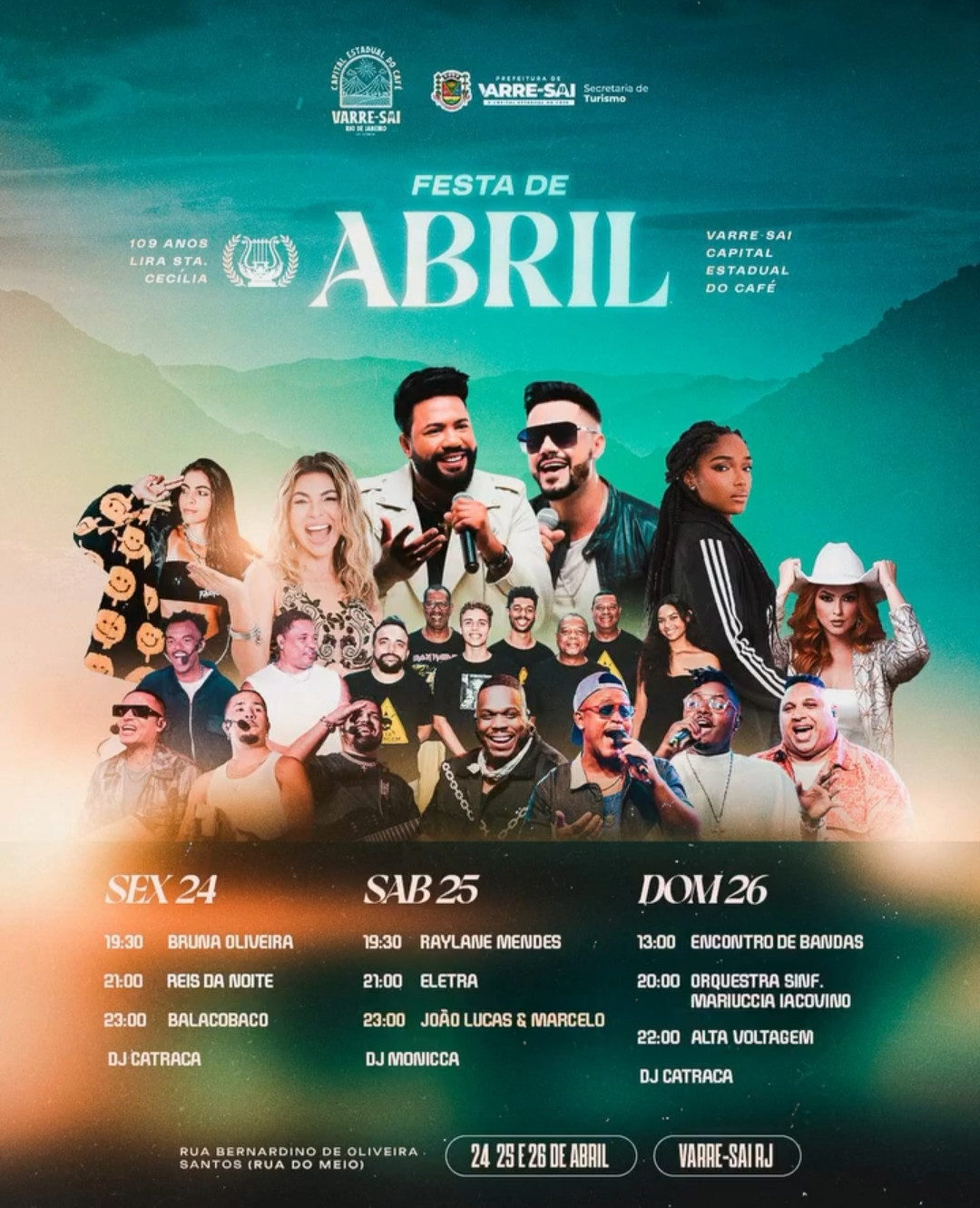 Festa de Abril Festa de Abril 2026 24 Abr - 2026 · 00:00 > 26 Abr - 2026 · 23:59 Varre Sai - RJ Festa de Abril (Foto: Reprodução)