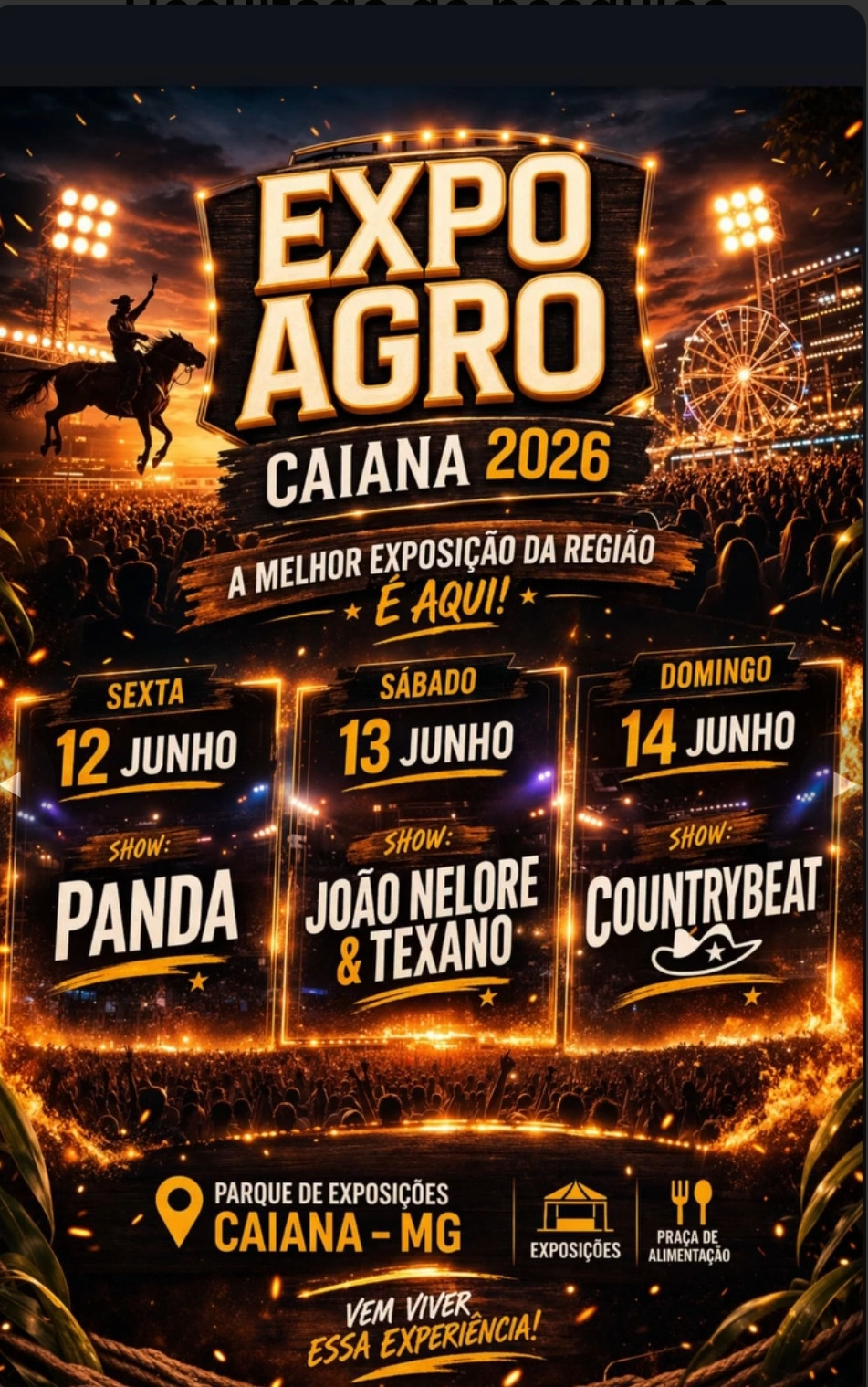 Expo Agro Caiana 2026 Exposição Agropecuária 12 Jun - 2026 · 00:01 > 14 Jun - 2026 · 23:59 Caiana - MG Expo Agro Caiana 2026 (Foto: Reprodução)